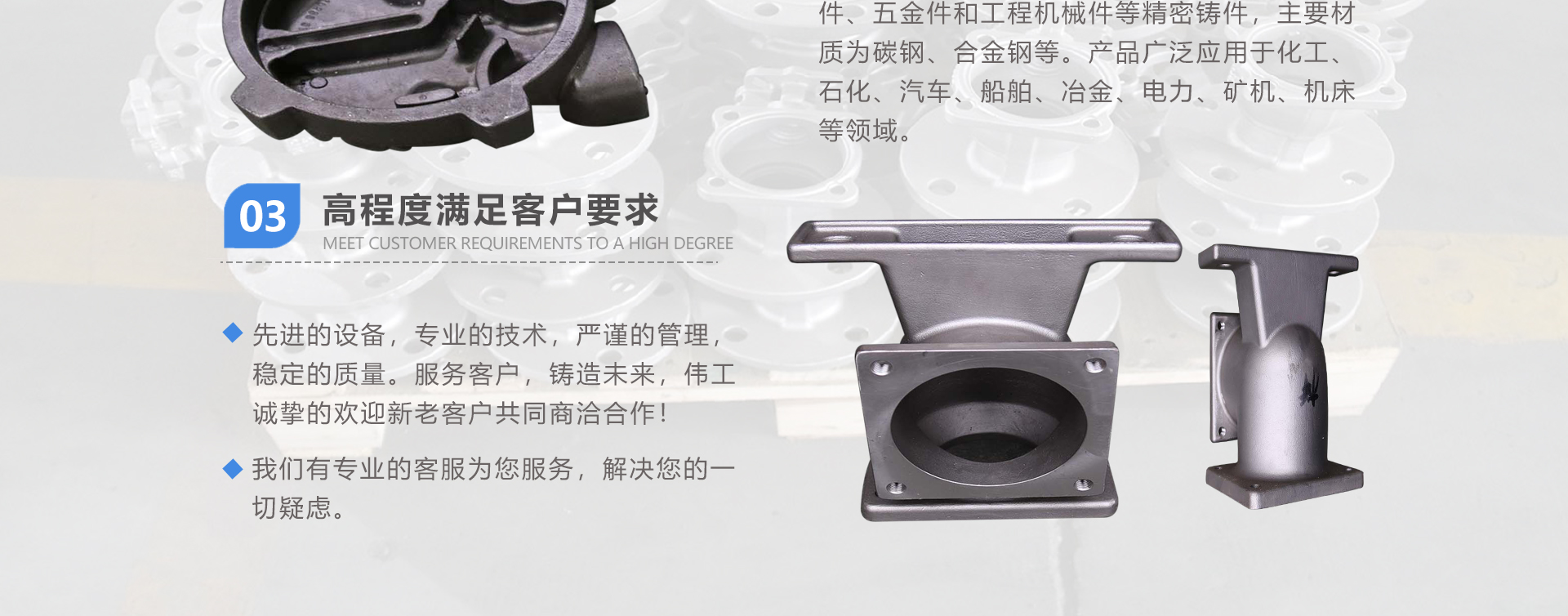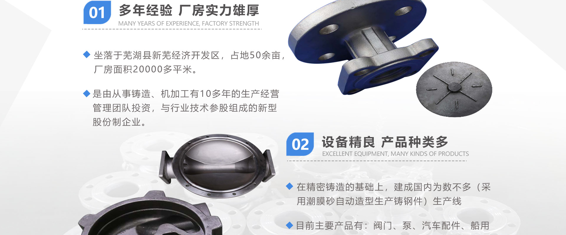 安徽偉工機械科技有限公司,坐落于安徽蕪湖新蕪經濟開發(fā)區(qū),是一家専業(yè)從事鑄造產品設計、研發(fā)、生產、銷售于一體的企業(yè),公司為客戶的產品提供多樣的技術支持與設計,公司主要鑄造技術有潮模砂鑄造、硅溶膠精鑄工藝。主要產品有:不銹鋼閥門配件、泵閥配件、汽車配件、工業(yè)管道配件、工程機械配件、汽車配件等。材質為:低合金鋼、304、316、316L、鉻鉬鋼、哈氏合金、碳鋼、雙相鋼等。公司已先后通過ISO9001和TS16949等多種體系審核,以完備的管理手段和齊全的檢測設備滿足客戶需求,進的設備,専業(yè)的技術,嚴謹?shù)墓芾恚€(wěn)定的質量。服務客戶,鑄造未來,偉工誠摯的歡迎新老客戶共同商洽合作